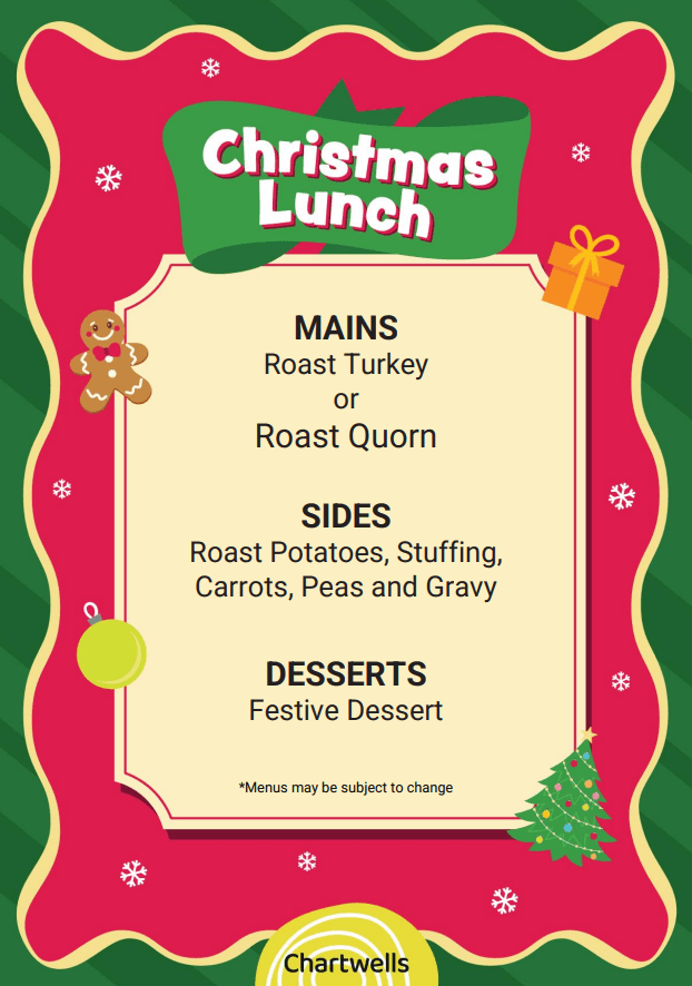 We will only be serving this menu- no jacket potatoes, sandwiches or other options available. If your child does not want Christmas lunch, please provide sandwiches from home. Thank you!